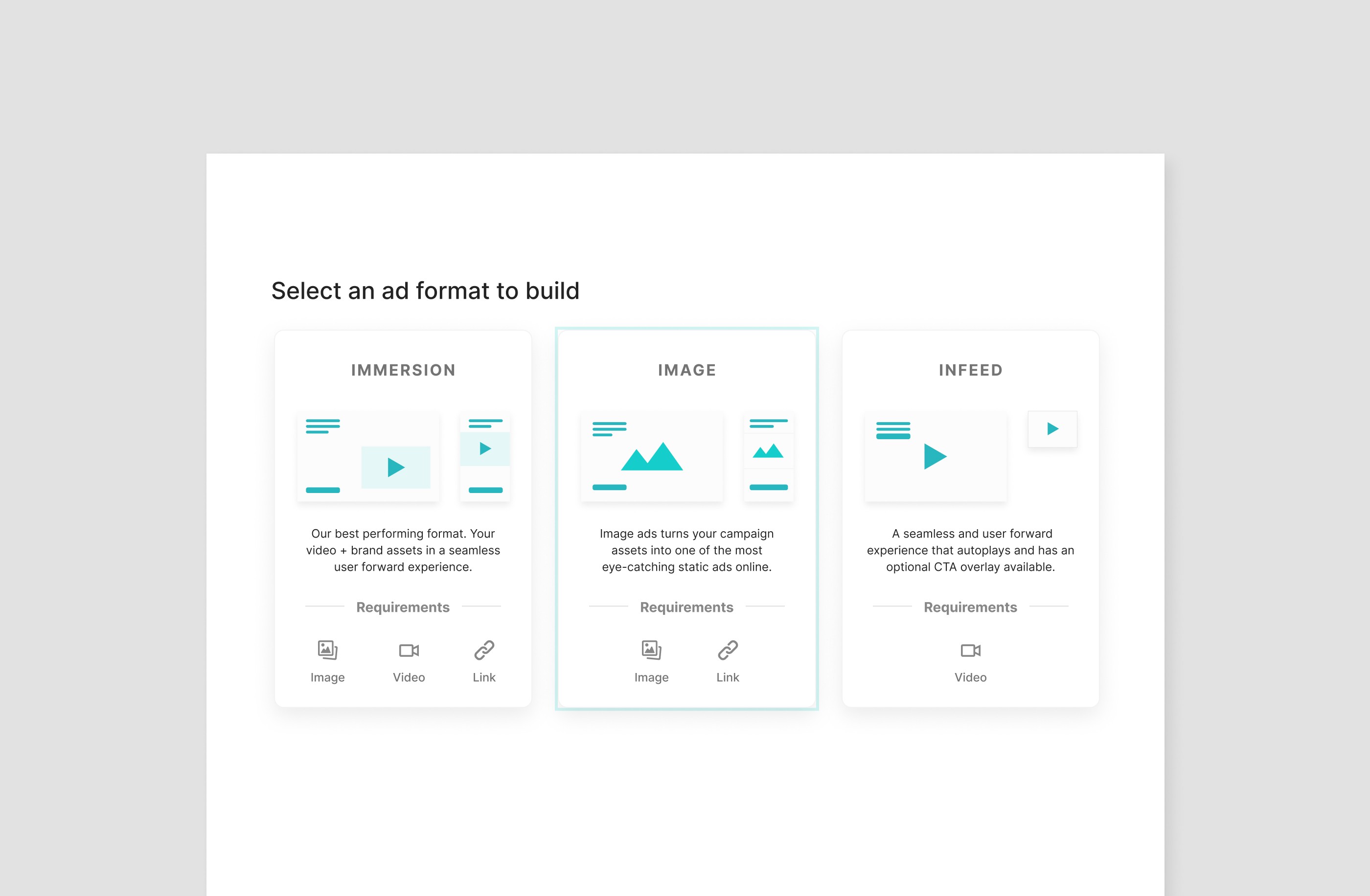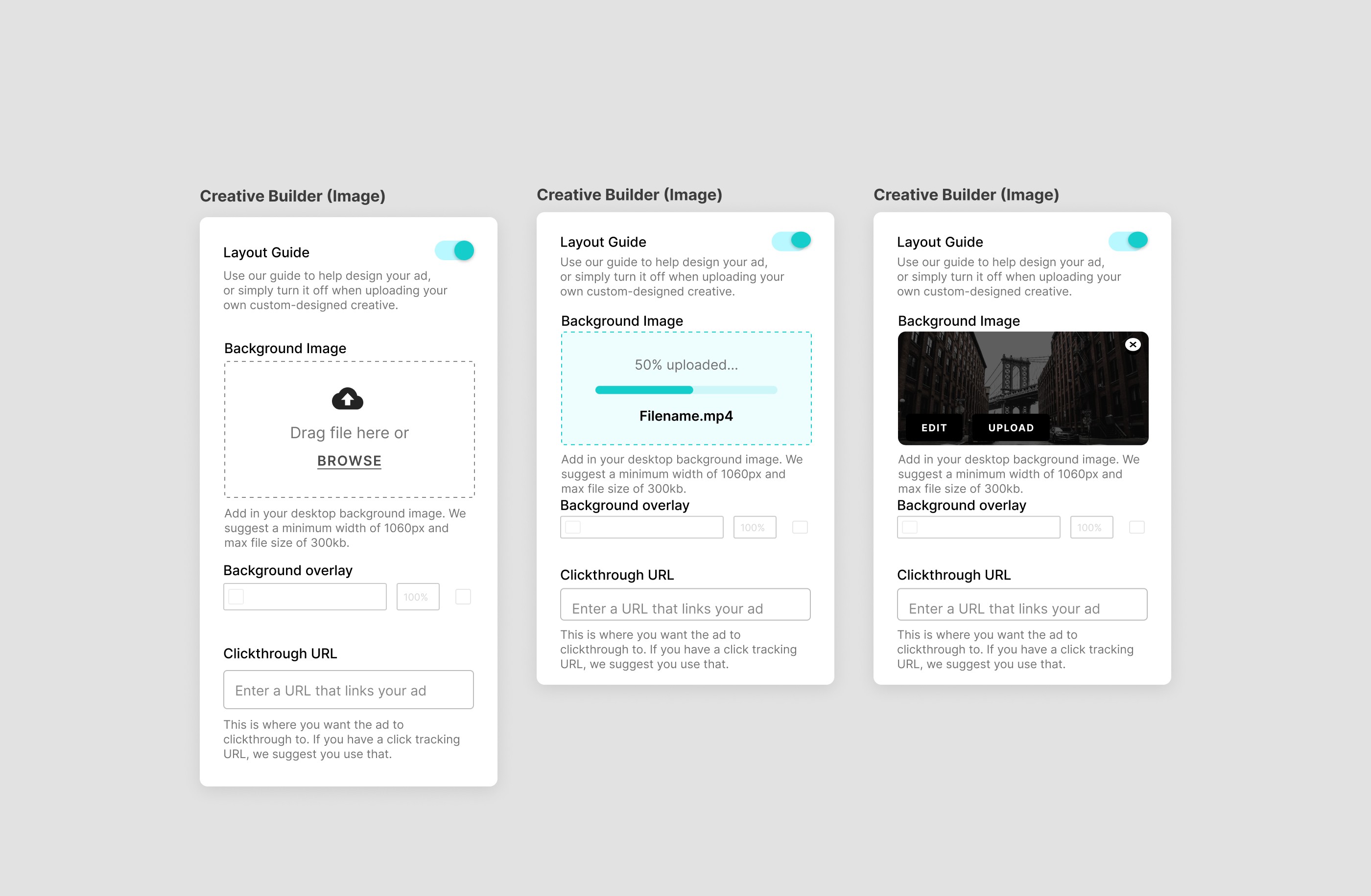 I translated the final direction into detailed specifications and component level documentation that guided engineering through the construction of a flexible, scalable creative engine. Since the Ad Creative Builder served as the foundation for all future features, I worked closely with engineers to define rendering rules, template logic, asset handling, and the handoff between creative assembly, campaign deployment, and post launch monitoring.