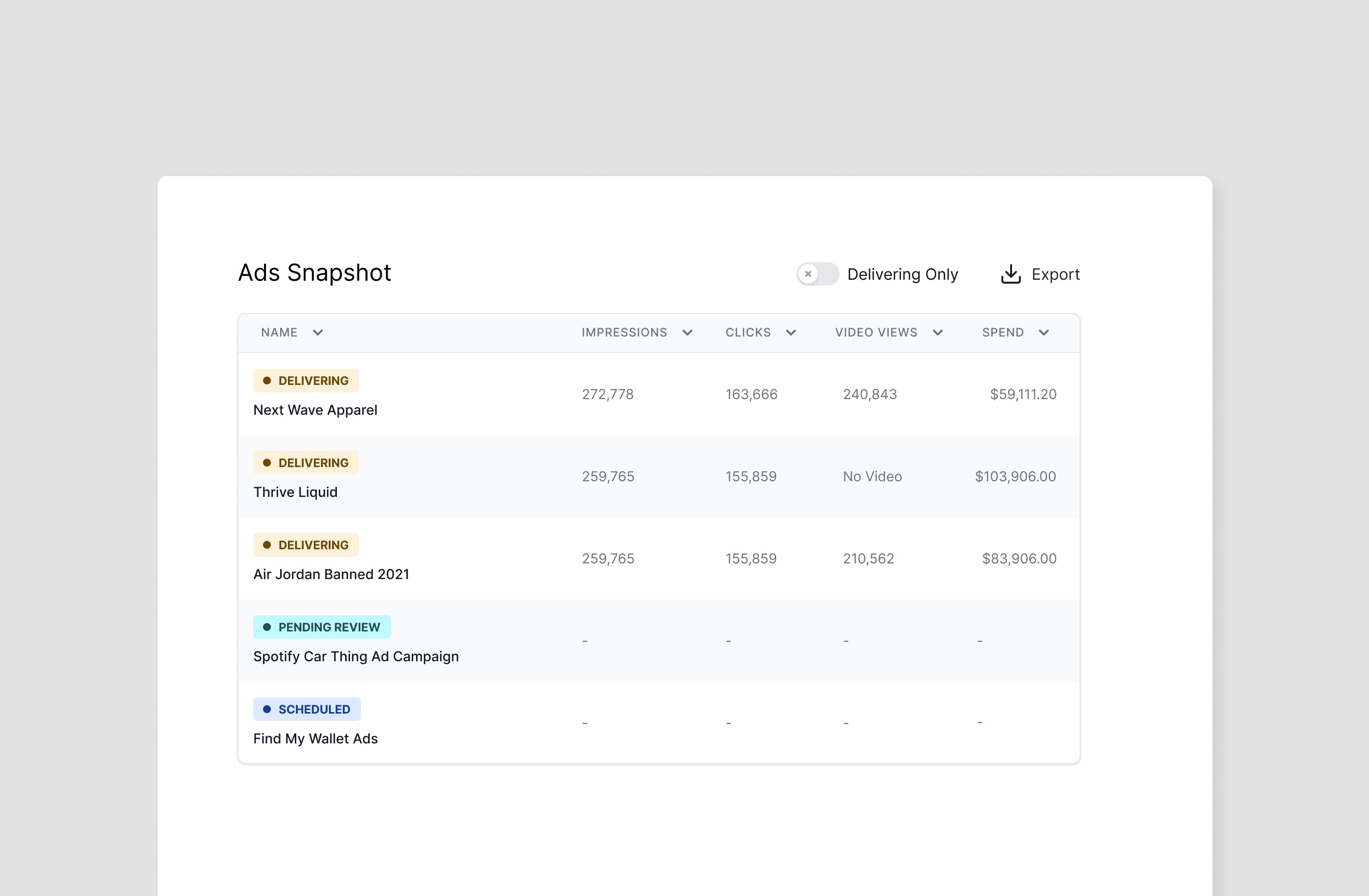 I approached this challenge by envisioning a dashboard that would complement the Ad Manager and act as a single source of truth for ad performance. The design strategy prioritized simplicity, clarity, and scalability: we needed a layout that presented key metrics at a glance, while still allowing users to dig deeper as needed.